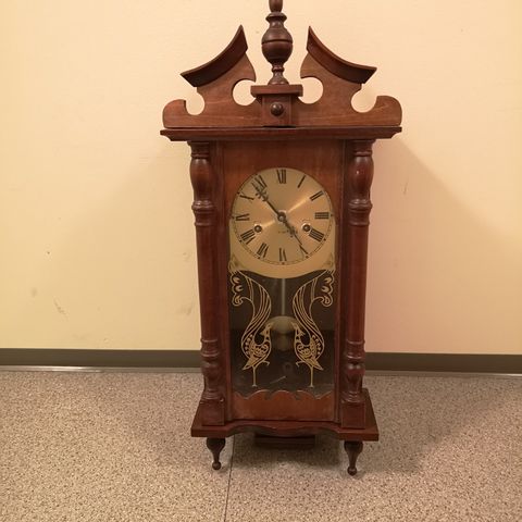 Pent brukt veggklokke med romertall og beige ramme selges. Enkelt oppheng. 59 cm i diameter.