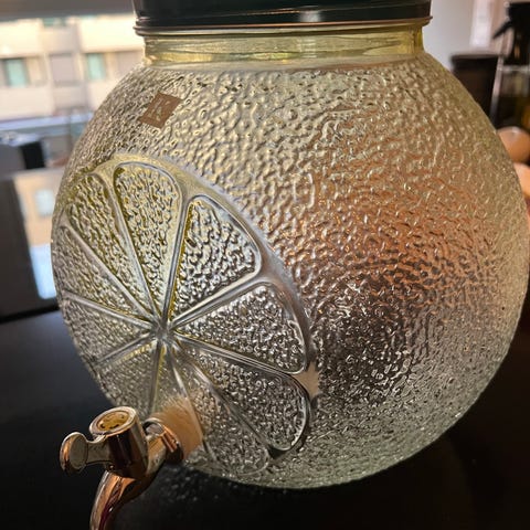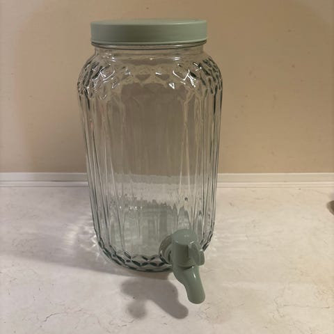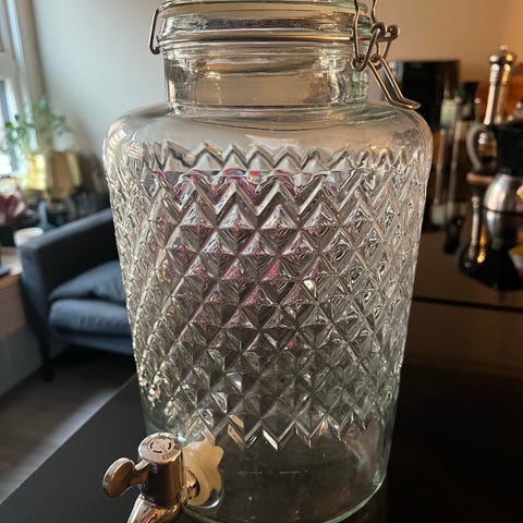 Drikkedispenser i glass med tappekran . Hel og fin, fungerer som den skal. Passer til vann, saft eller lemonade. Må hentes på Veitvet