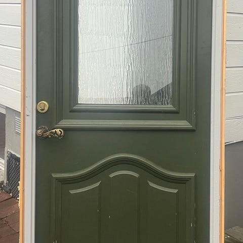 Hvitt tredør med et diamantformet vindu. Døren har en enkel design og er laget av tre. Den passer til bruk i bolig eller garasje. Dørens mål og ytterligere detaljer er ikke oppgitt. 82x200cm
