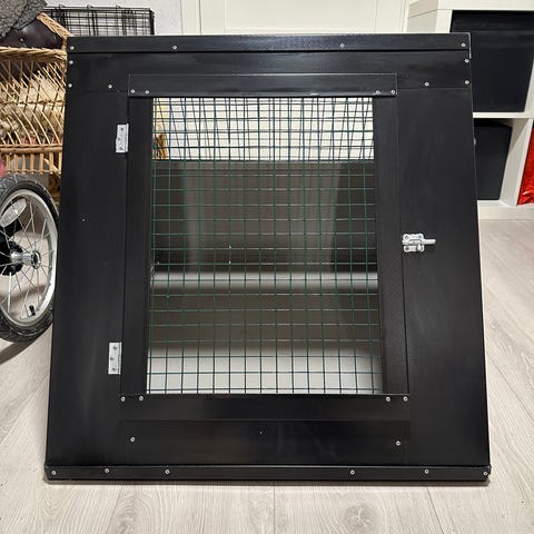 Trønderburet hundebur med metallgitter og lukking. Buret er laget for transport av hunder og har solid konstruksjon med metallramme og gitter for ventilasjon. Passer til bruk i bil for sikker hundetransport. Spesiallaget for Nissan Leaf NConnecta 62kwh 2021 modell (uten lydpakke)