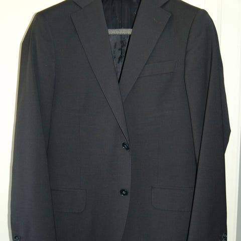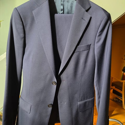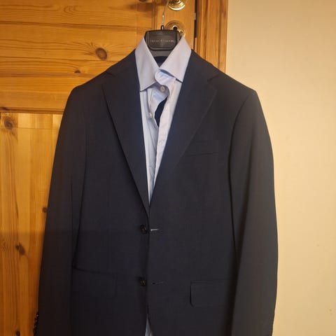 Oscar Jacobson dress i blå farge laget i polyester/ull-blanding. Jakken i størrelse 44, typisk 14-15 år. Den har klassisk snitt.