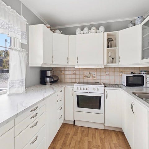 Kjøkkenet er solid og har eikemønster. Hvitevarer er komfyr med stekeovn, ekstra stekeovn, mikro og oppvaskmaskin.