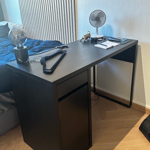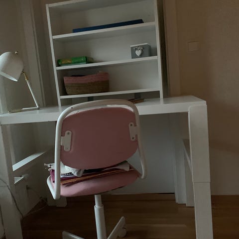Selger en hvit og praktisk skrivepult med matchende stol. Pulten har god plass til bøker, tegnesaker og skolearbeid.
