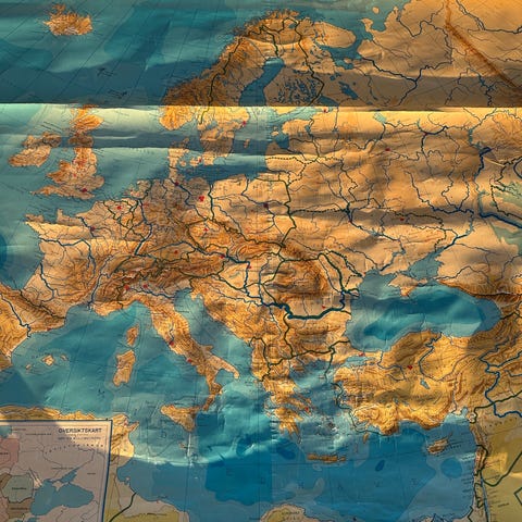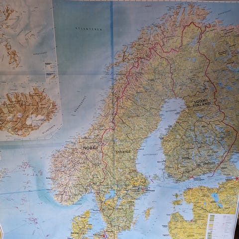 A 10 stk retro Skolekart m komlett opphengsstativ med detaljerte kart over den vestlige og østlige halvkule. Norgeskart Europa -Kartene viser geografiske og topografiske trekk, inkludert land, hav og fjellkjeder. Egnet for undervisning og læring om verdens geografi.