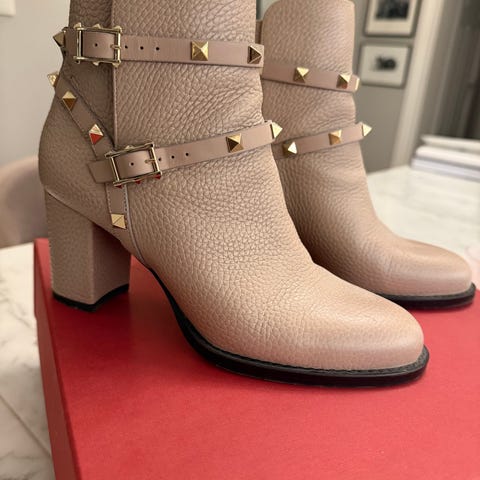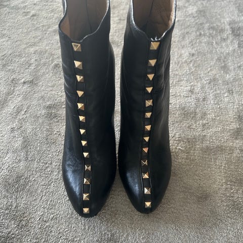 Valentino ubrukte støvler i størrelse 37. Brun farge. Støvlene har en høy blokkhæl og er dekorert med metallnagler langs fronten. Materialet er skinn med stoff på siden. Sålen har mønster for bedre grep.