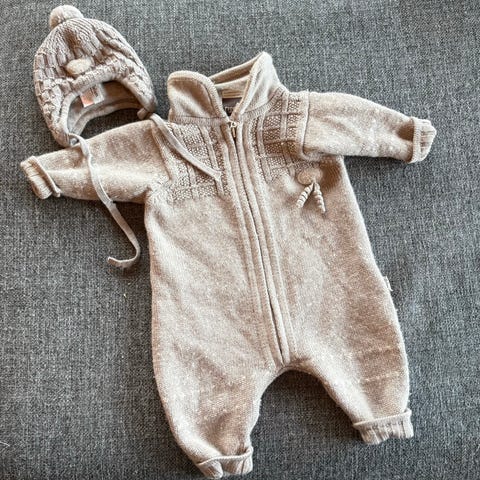 Rød lillelam dress og lue i ull. Pent brukt, og mye bruk igjen.
