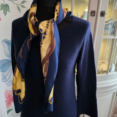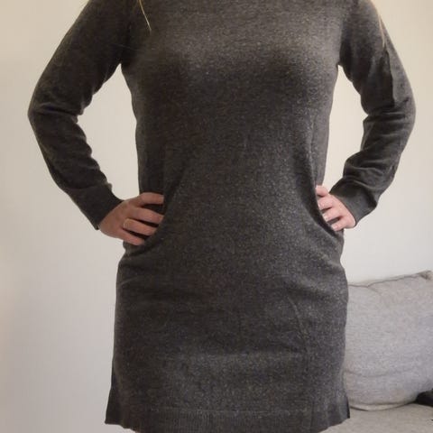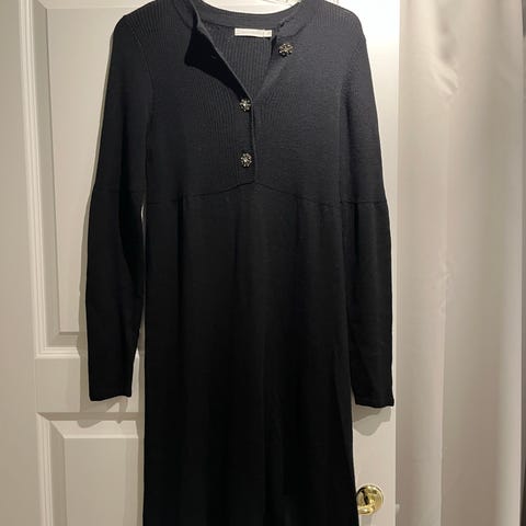 Pent brukt ullkjole fra Safa i str S. Litt tettsittende. Svart med sølvstriper nederst på kjole og armer og i hals. Lengde til midt på lår.