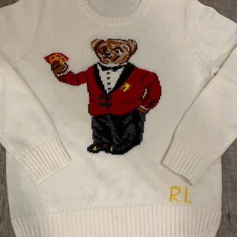 Selger en stilren og klassisk Polo Ralph Lauren strikkegenser med ikonisk Polo Bear-motiv. Genseren er mørkeblå og har brodert/strikket bjørn iført baseball-uniform med Polo-detaljer. Et tidløst og ettertraktet plagg fra Ralph Lauren.
