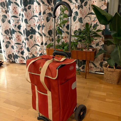 Søkeord: handletralle, trillebag, handlevogn, shopping trolley, trillevogn, handlebag.