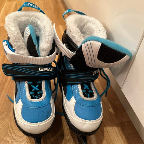 CCM ishockeyskøyter og hjelm. Skøytene er i svart og hvitt, designet for ishockey. Hjelmen er hvit med metallbur for ansiktsbeskyttelse. Skøyter str 28. både hjelm og skøyter passer barn på 2-3 år.