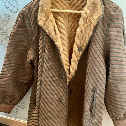 Størrelsen er mellom 38-52, (oversize) gir en romslig og komfortabel passform. Brun farge, myk, god og varm. Selges rimelig for 6700kr.