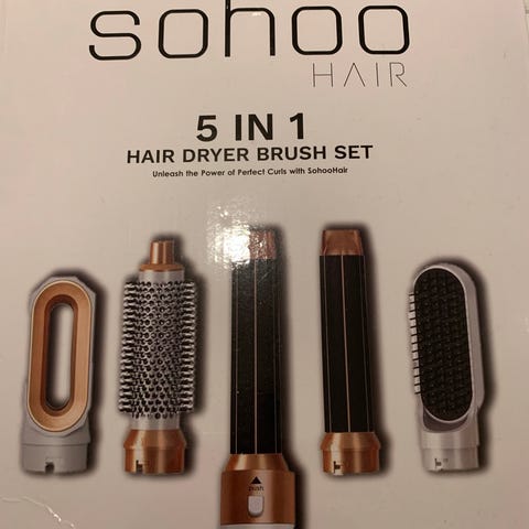 Sohoo 5 in 1 hårfønerbørstesett med flere utskiftbare børstehoder for styling, inkludert rettetang, krølltang, volum børste og kam. Produktet er designet for effektiv hårstyling og tørking med ulike børsetyper for forskjellige frisyrer.