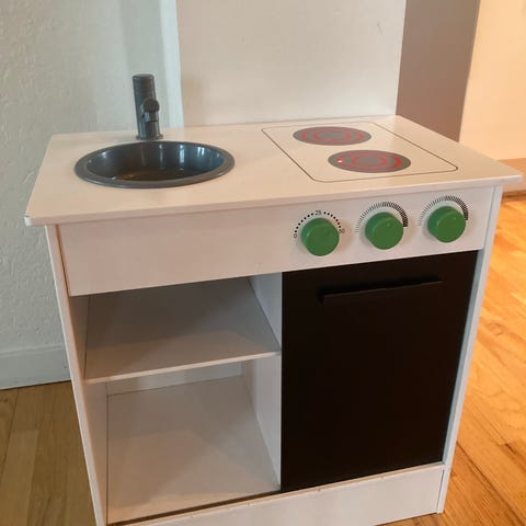Selger et pent brukt lekekjøkken fra IKEA som ungene har vokst fra. Koketoppene fungerer slik de skal. Det følger med kjeler, kjøkkenredskaper, grytelapper og diverse lekemat.