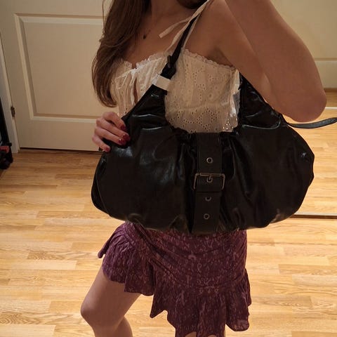 Skulderstropp som kan tas av - 82 cm Håndstropp - 35 cm Bunn av vesken: 35 cm x 11 cm