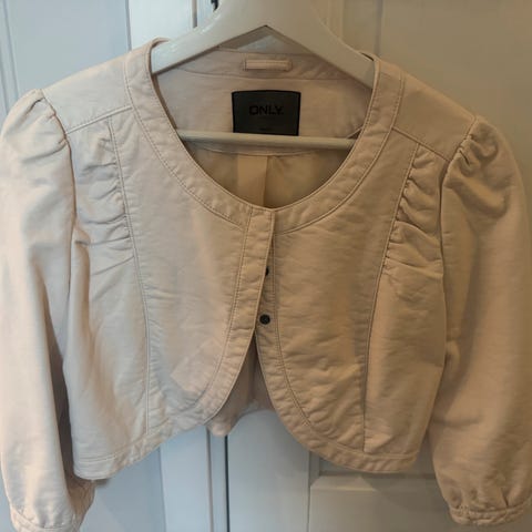 Bik Bok speilfløyel bolero/jakke i svart farge, størrelse M for kvinner. Jakken har knappelukking foran og dekorative perler langs kantene. Hentes i Ila
