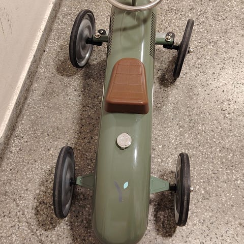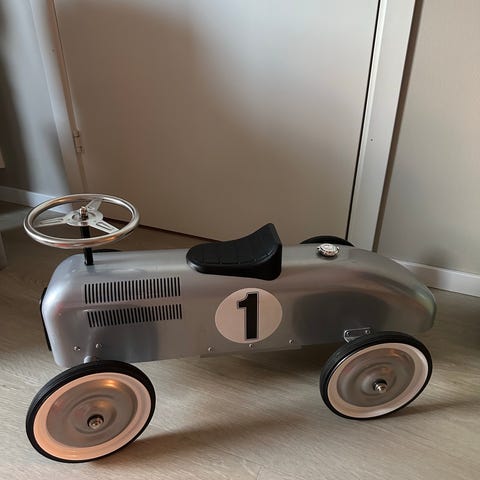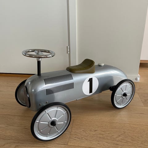 Pent brukt grå gåbil/stor lekebil. Pent brukt, noe bruksmerker men det er beskjedent. Synes mest ved festet av hjulene (se bilder), og 1-tallet bakerst på bilen er litt slitt, de andre tallene er ok.
