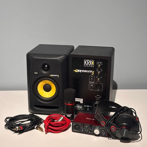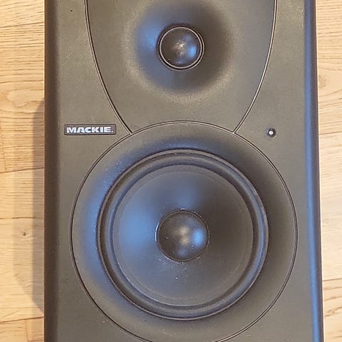 Mackie CR5BT studiemonitorer med 5 tommers høyttalerelementer i svart farge. Inkluderer en aktiv høyttaler med Bluetooth-tilkobling og en passiv høyttaler. Utstyrt med innganger for RCA, 1/4" TRS og 3,5 mm jack. Designet for bruk i lydproduksjon og miksing.