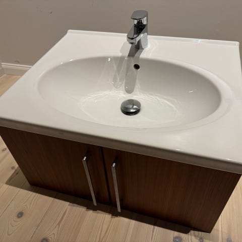 Servant i hvit støpemarmor. Har hull for armatur og overløp. Sitter med 16 stk etter feil leveranse.