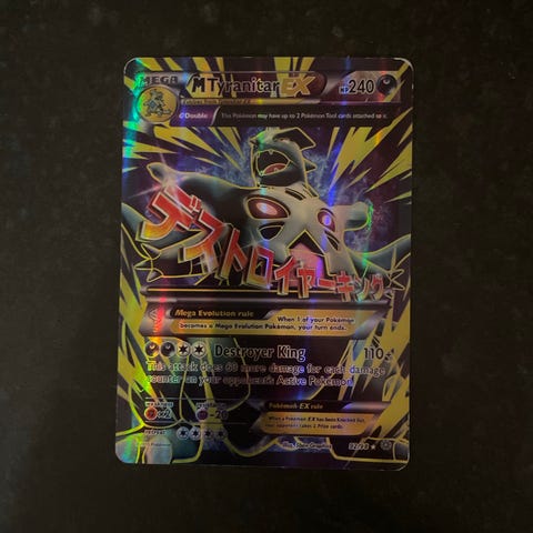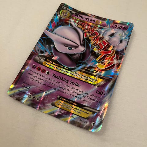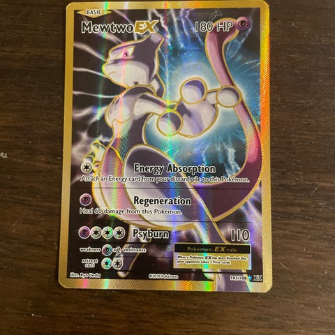 Pokémon Mewtwo EX samlekort i plastbeskyttelse. Kortet har illustrasjon av Mewtwo og inneholder angrepsinformasjon og poeng. Passer for samlere og spillere av Pokémon-kortspill.