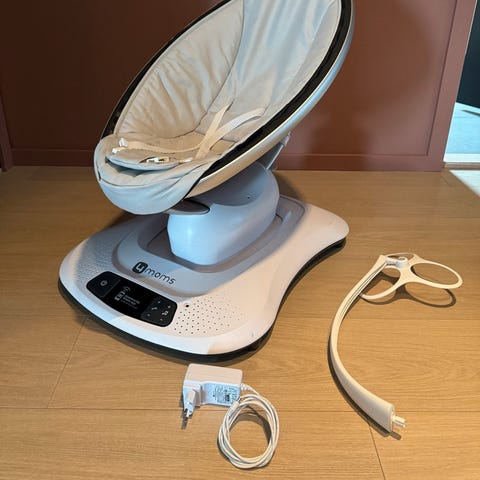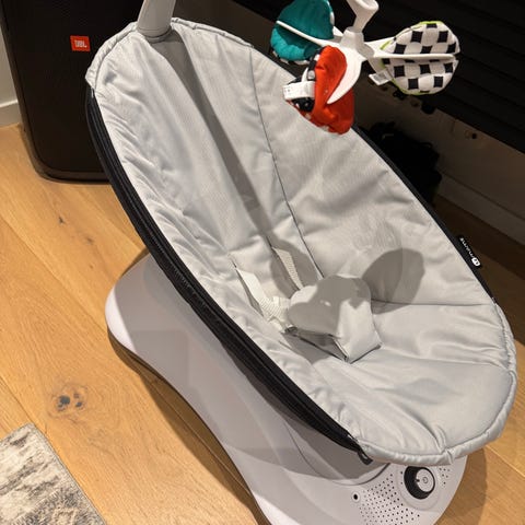 4moms mamaRoo barnestol med unik design for komfort og bevegelse. Stolen har et moderne utseende med mønstrede trekk og elektroniske funksjoner for å etterligne naturlige bevegelser.