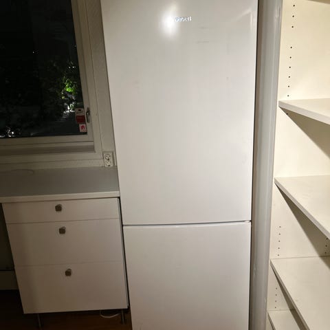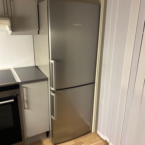 Bosch kombiskap i rustfritt stål i 201 cm høyt, med fryser nederst. Kjøleskapet har flere hyller og skuffer for oppbevaring av matvarer.