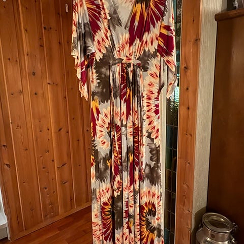Ilse Jacobsen sommerkjole i størrelse S med flerfarget mønster. Ca 132 cm lang. Laget av polyester materiale, passer trolig også til størrelse M.