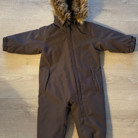Name it Vinterdress i størrelse 80. Vinterdressen er vanntett med 10 000 mm vannsøyle og pusteevne på 4000 g/m2/24h. Den har avtagbar hette med pels, elastiske mansjetter og fotstropper for bedre passform