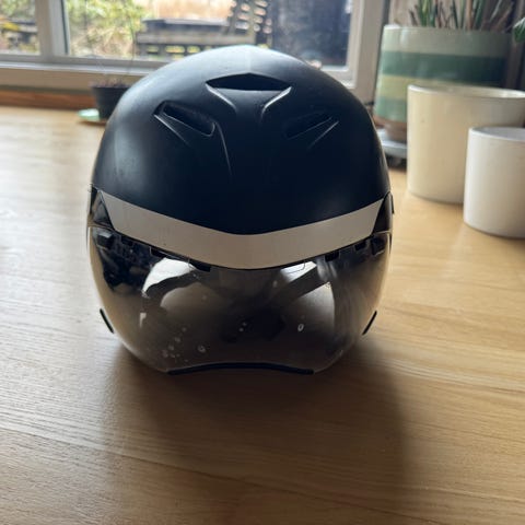 Kjøpt på finn i 2025 for 900 (prutet ned fra 1100), men ikke brukt av meg da jeg fant den litt for liten, jeg er en 57-58cm (medium). Jeg får den på meg, men den er smal over ørene og stroppen er kort under haka mi.