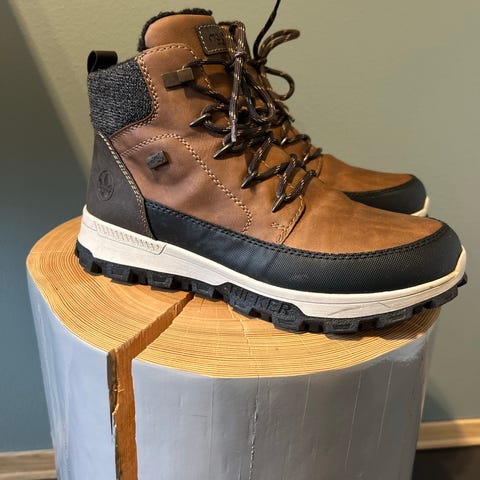 Rieker vinterstøvler i størrelse 42. Støvlene er svarte og har snøring samt glidelås på siden for enkel på- og avkledning. Yttersålen har godt mønster for bedre grep. Innsiden er foret.