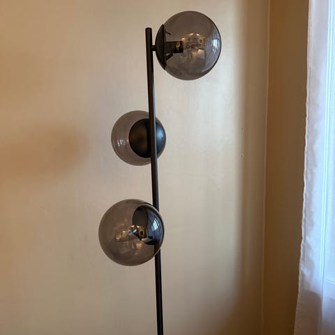 Gulvlampe med svart lampskjerm og metallramme. Lampen har en fotbryter på ledningen for enkel av- og påkobling. Passer til ulike rom som stue eller soverom. Skjøten på lampeskjermen har gått opp litt i limingen, men den ligger tett inntil hverandre når lampeskjermen er på lampen, og vil derfor ikke synes. Kan enkelt limes. Ellers er lampen pent brukt og er pen i finished.