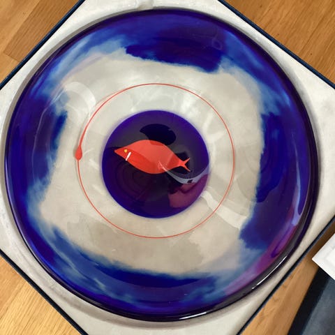 FINNE, FERDINAND (1910-1999). "Fat til glede" nr. V. "Nathimmelfatet". Sign. langs rand: "998/2000 Ferdinad Finne '99". Serien "Fat til glede" består av en serie på 6 fat, som ble utgitt i anledning av Ferdinand Finnes 90-årsjubileum. Bruksspor. Ø: 36,5 cm