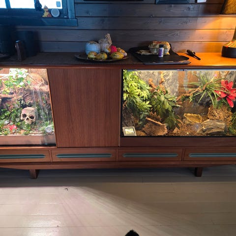 Terrariet har vært brukt av min Leopardgecko i fem år og har vært et trygt og godt hjem. Nå har Geckoen fått et nytt hjem, så håper dette terrariet finner en ny eier som setter pris på oppsettet!