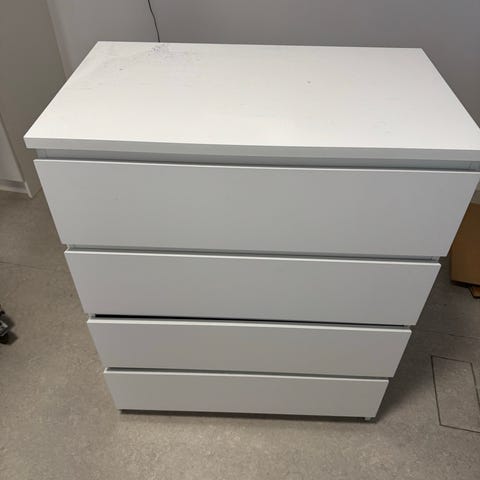 Kommoden er i god stand. Den tredje skuffen er litt treg å dra ut, men fungerer fint og er ikke et stort problem.