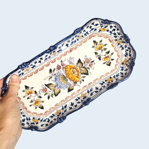 Pent tapasbrett i tre med tre skåler i blander av blå/grønne farger .