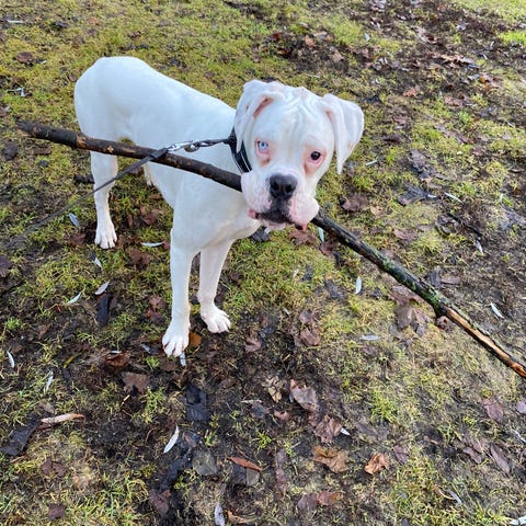 Hun er litt av en blandingsmix. Far er langhåret amerikansk akita, mor halvt rottweiler, kvart doggo og kvart amerikansk bulldog.