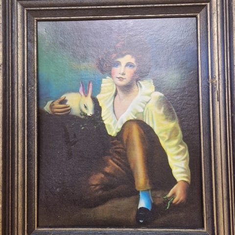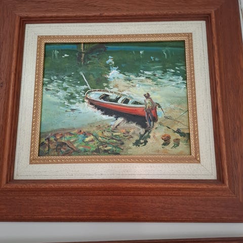 Fem malerier med ulike natur- og landskapstemaer, inkludert innsjø med ender, kvinne med hund ved vann, blomsterhage, to jenter ved vannkanten og solnedgang over sjø. Maleriene er innrammet i forskjellige rammer. 🖼️