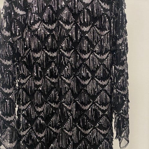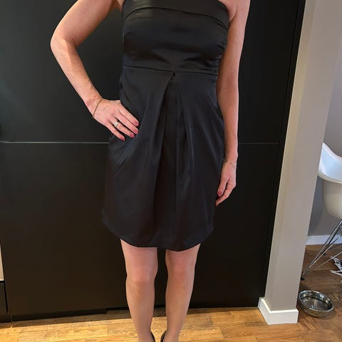 Svart kjole i viskose og polyester, perlet mønster. Åpen under armene med svart topp under. Sitter utrolig fint på er merket som str34, Jeg pleier å bruke 36 og passer fint.