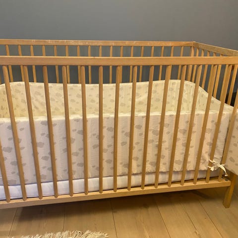 Sengen har noen bruksmerker, så trenger kanskje et strøk maling? Men den er også fullt brukbar som den er nå. Jeg brukte den til mitt barn fra han begynte å krabbe, og til han fant ut av å klatre ut av denne rundt 2,5 års alder. Leveres flatpakket.