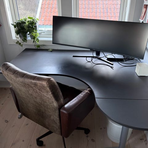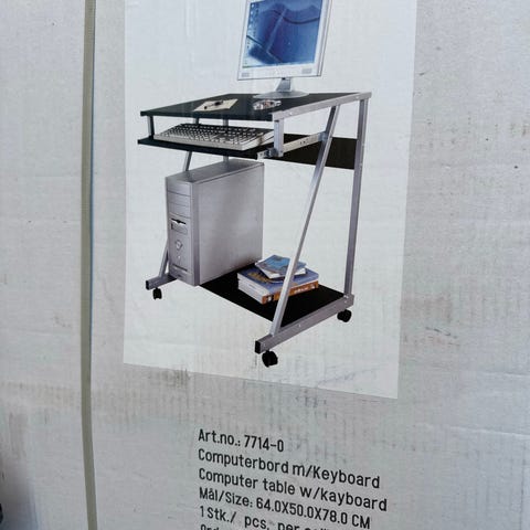 Selger et greit pcbord / skrivebord. Bordet er helt og greit. Det er noen små bruksmerker. Det er hjul under bordet så det er lett å flytte på. Tastaturhylle kan draes ut om han ønsker. Str på bordet lengde 130 cm, bredde 67 cm høyde 75 cm. Må hentes.