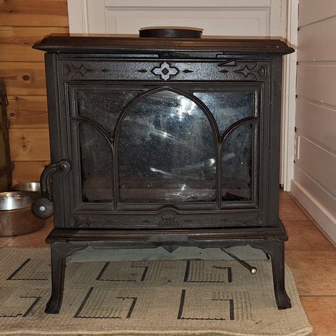 Jøtul F 220 vedovn med svart farge. Ovnen har glassdør for innsyn til flammene og er laget i støpejern. Passer til oppvarming av bolig med ved som energikilde.