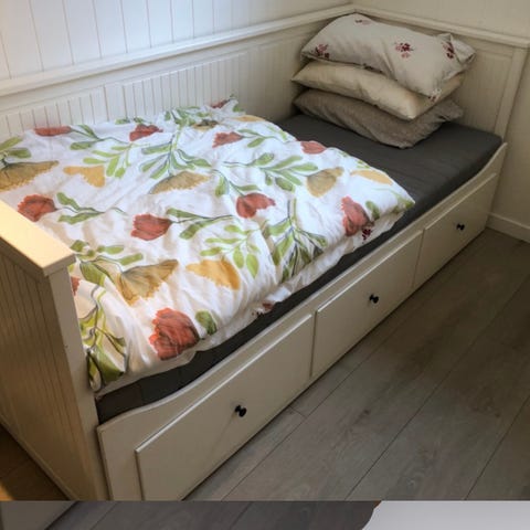 Hemnes seng fra IKEA selges. En veldig praktisk seng med tre skuffer til oppbevaring. Er også dobbeltseng, noe som er veldig greit til overnattingsgjester.