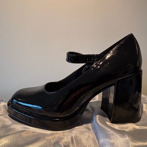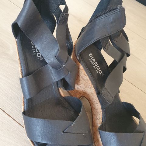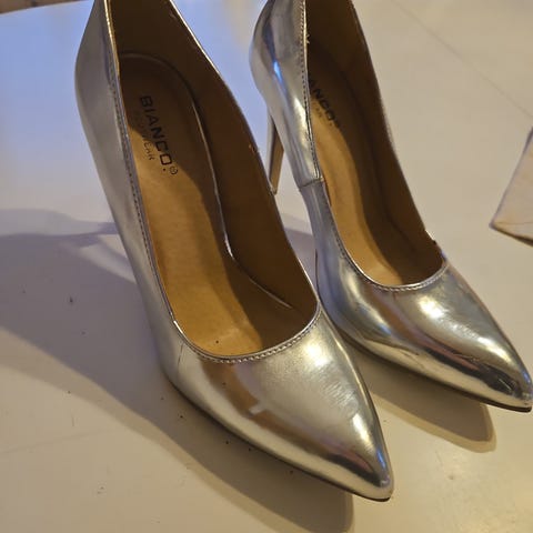 Bianco hæler i størrelse 39 med svart farge. Skoene har en dekorativ sløyfe på forsiden og åpen tå. Passer til bruk som formelle eller festlige sko.