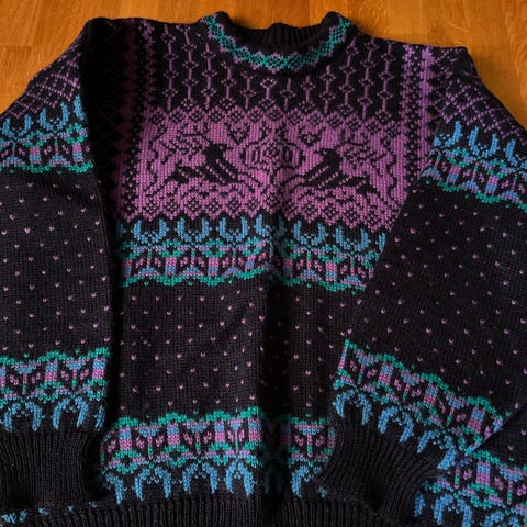 Kul og fargerik strikkegenser i ullblanding, med retro mønster i rødt, rosa og kontrastfarger. En skikkelig statement-genser!