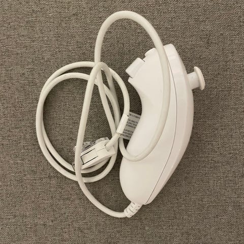 Selger en Nintendo Wiimote med nunchuck samlet.