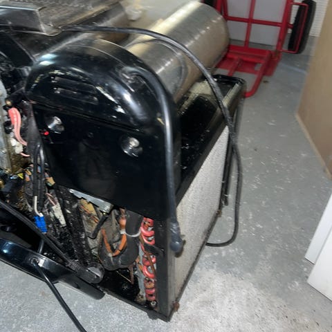 Døren er lutt buet og tetter ikke helt med pakkingen. Kjøling og luftkompressor fungerer.