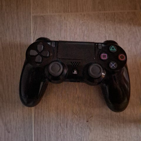 Sony DualShock 4 PlayStation 4-kontroller i blå farge. Trådløs kontroller designet for PlayStation 4 med innebygd berøringsplate, bevegelsessensorer og innebygd høyttaler. Passer til spill på PlayStation 4-konsollen. På den ene funker ikke pila med funker noen ganger av og til