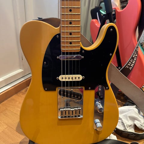 Fender Acoustasonic player Telecaster halvakustisk gitar med hvit front og trefarget. Solid spruce topp. Action er meget lav og behagelig. Er juster profesjonelt. Akkurat kommet rett fra service med nye elixir 010 strenger, oljet gripebrett renset bånd osv. fantastisk kompromiss mellom akustisk og elektrisk gitar som bør prøves. Har en solid bag som følger med. Det er 6 forskjellige lyder å velge mellom. Og blend i mellom hver 2. lyd.