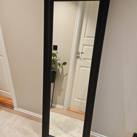 Smalt speil med svart ramme selges. Speilet er i god stand med unntak av et hakk i rammen, se bilde.