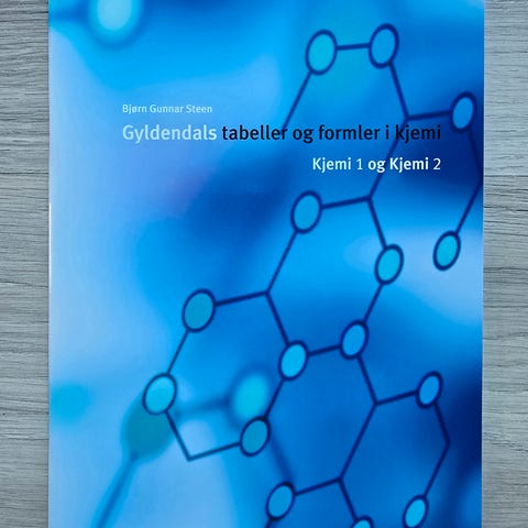 Gyldendal Kjemi 1 og Kjemi 2 Kjemibok med fokus på kjemiske formler og tabeller. Inneholder periodiske system og relevante kjemiske data for fagene Kjemi 1 og Kjemi 2.