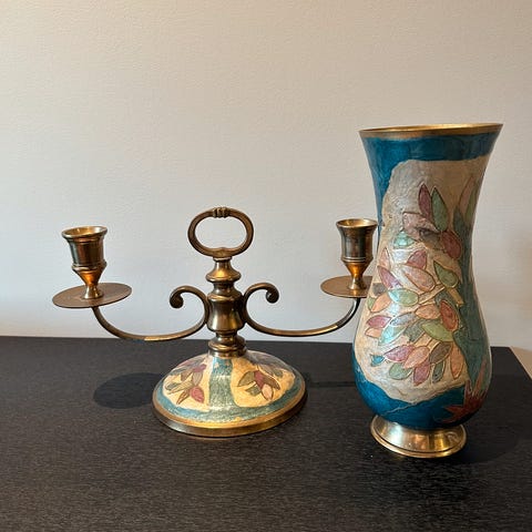 Selger ett gammelt sett av 2 vaser og 2 lysholdere i messing, gull farget.